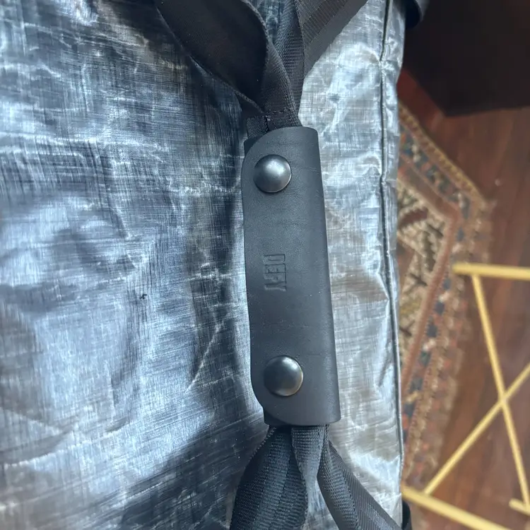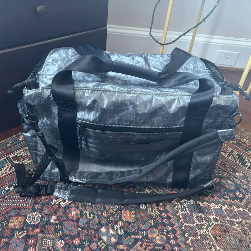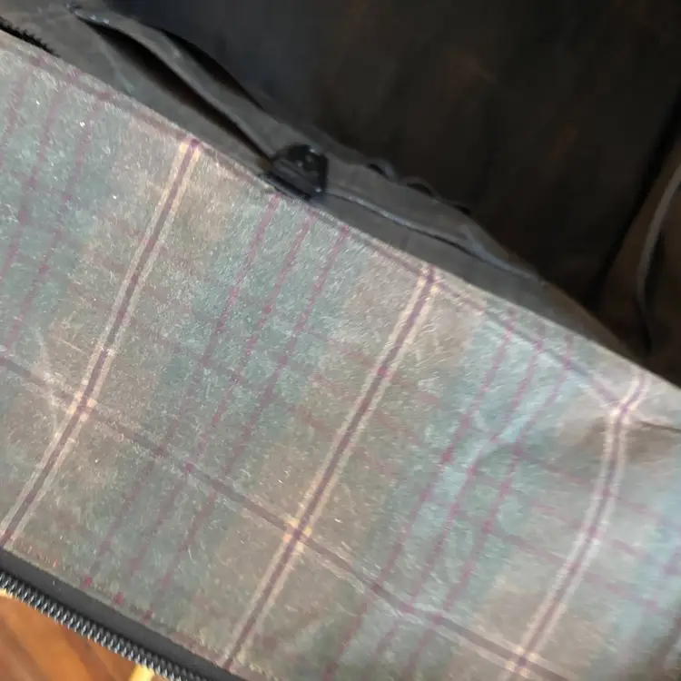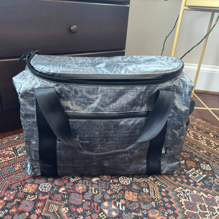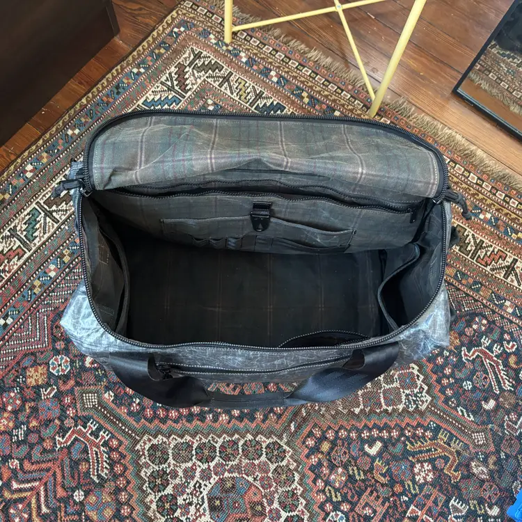 Incredible custom Rover travel backpack from Defy Bags, handmade in Chicago, USA. Features a fully Dyneema exterior, waxed canvas plaid interior. 40 L carry capacity; design allows bag to reliably stand up even when empty. Exterior zipped pocket and two drop pockets, interior admin panel, zipped pockets, leather grab handle, and padded laptop sleeve.